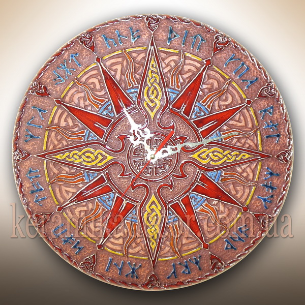Часы красивые настенные керамические в глазури со Славянскими рунами купить на подарок в дом, в офис, на террасу